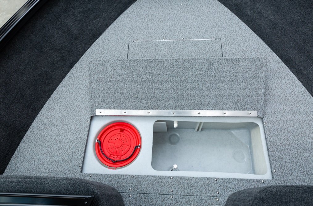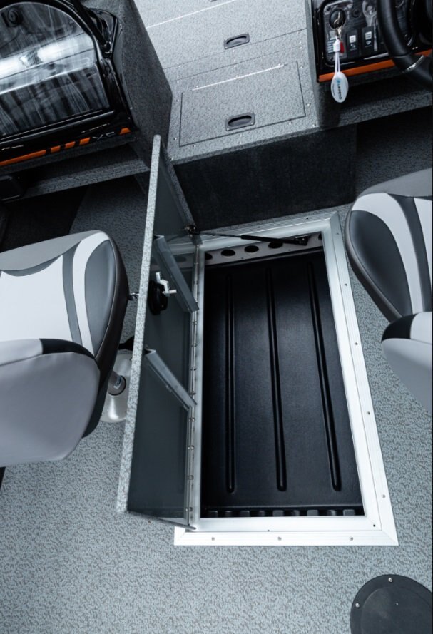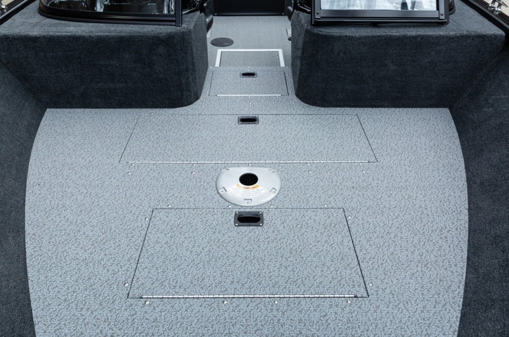 Decks and Storage Rear battery storage area Lockable in-floor rod locker with tube holders for 6 rods 7' port and starboard integral lockable rod boxes 6 drink holders Large port and starboard bow storage compartments Large bow center storage compartment Large rear casting deck with seat mount
