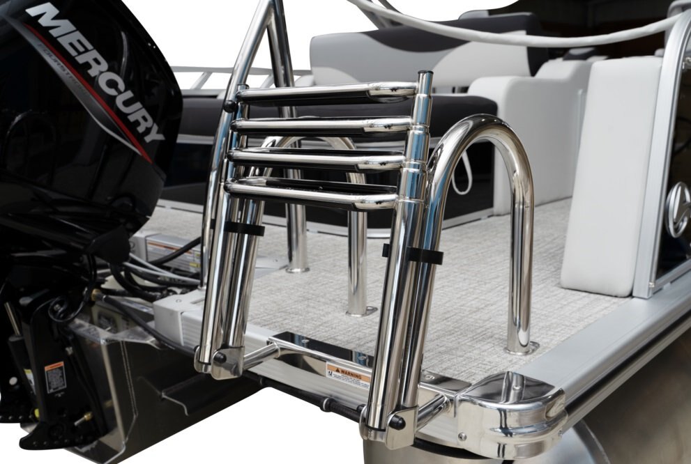 Construction Large 25" diameter .090 gauge pontoon tubes 4 deck-mounted lift and mooring cleats Through-bolted floor fasteners and double-sealed seams 3 gates with posi-lock latches Anti-vibration foam-backed quiet fencing Tough shark-nosed cones with spray-deflecting fins Performance-enhancing all-aluminum v-transom Pressurized triple-section tube design with ez-drain plug Full-length protective extruded keels on tubes Individually treated 3/4" 7-ply marine-grade plywood 1 1/4” raised aluminum fence rails with 3/8” risers Vinyl non-skid strips for entry gates Extra-wide 8'5" beam Easy access bow, port side and stern gates 22 Ft Tubes 25 Gallon Direct Fill in Mount Fire Extinguisher Premium Stainless Telescoping Ladder