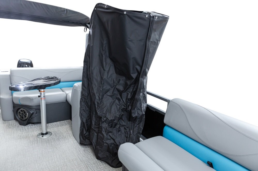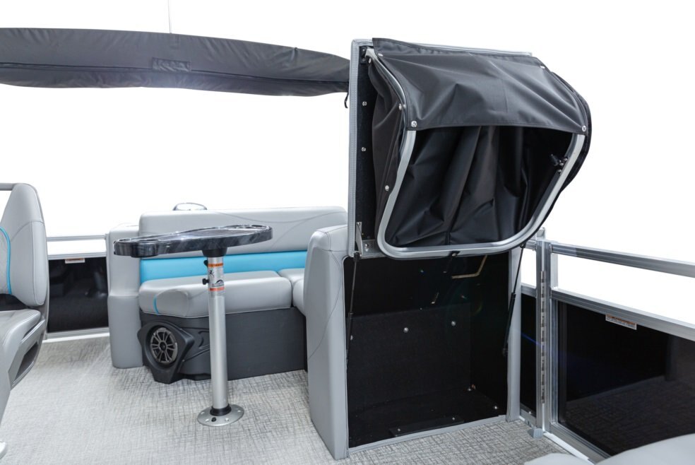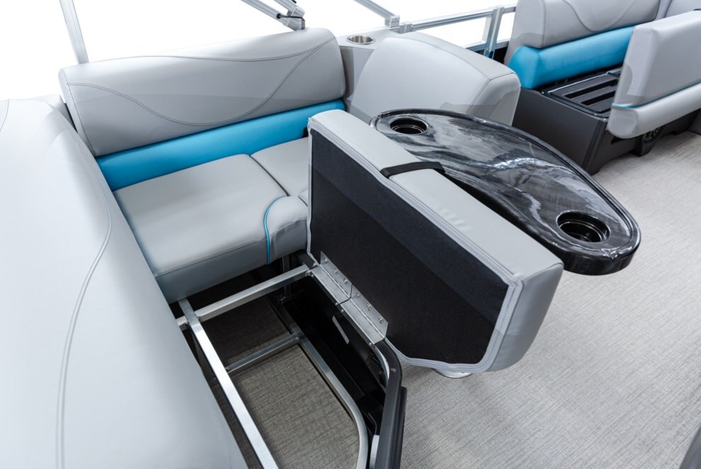 Decks and Storage Stainless cup holders Bow USB Charging Port Bow USB Charging Port Riptide Shadow Flooring Polished Corner Caps 4 U Bolt and Cleat Combo Small Greywood Kidney Table w/ Base Small Greywood Kidney Table w/ Base Charcoal Cladding Heavy Duty Rub Rail with w/Insert Privacy Station in Privacy Arm